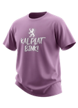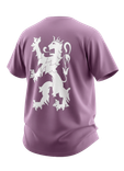 Roze T shirt voor iedereen die trots is op Limburg. Voorop de leeuw met Kal plat bink. Achterop groot het Limburgse wapen, met een Wiesse Oet Zuus sticker in de hand.